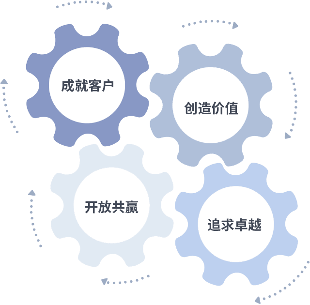成就客户是一切决策的出发点,,,创造价值是衡量所有工作的标准,,,,追求卓越是我们做事做人的态度,,,,开放共赢是我们的格局也是最终的结果。。价值观的齿轮环环相扣,,推动着组织里的每个人不断向前。。。。